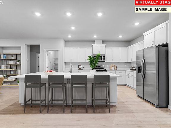 This new construction two-story home is set in a planned community with a sport court and playground, near greenspace, schools, shopping, dining, and freeway access. The Sellwood plan includes a den near the entry, a main-level bedroom tucked at the back, and an open-concept great room with fireplace, kitchen, and dining area opening to a covered patio. Upstairs, four bedrooms and a bonus room surround the private primary suite with a retreat space, soaking tub, and walk-in closet. A 3-car garage provides plenty of space for parking and storage. Interior finishes include quartz countertops, shaker-style cabinets, LVP flooring, and two-tone paint. This home also includes central air conditioning, a refrigerator, washer and dryer, and blinds—all at no extra cost! Located on homesite 62, this home is move-in ready! Rendering is artist conception only. Photos are of a similar home, features and finishes will vary.