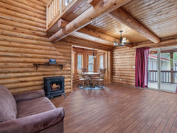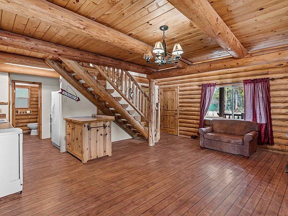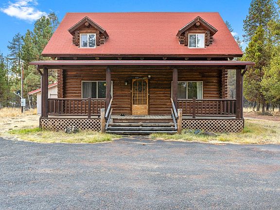 Nestled amongst the mature pines on 1.19 acres this property is home to a classic 2 bed/2 bath log cabin w/covered front & back porches, 2 bay garage, storage buildings & plenty of room for all of your toys, RVs, outdoor entertaining & more. Log home ftrs open-concept living area w/vaulted ceilings, warm wood accents, cozy propane fireplace & large windows that invite an abundance of natural light. Kitchen is fully equipped w/plenty of cabinet storage & counter space, appliances included & a cozy eating area w/bay windows. Two bedrooms & two full baths plus washer/dryer. Community water and sewer now connected!!! Short term rentals allowed. Located near La Pine State Park, Deschutes National Forest, a short drive to Sunriver Resort for golfing or dining, Mount Bachelor & all that Central Oregon recreation has to offer. Whether you're looking for a full-time residence, vacation getaway, or rental investment, this log home offers a rare combination of charm, privacy, and convenience.