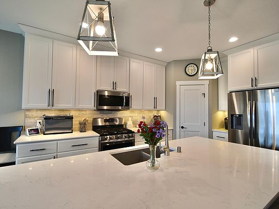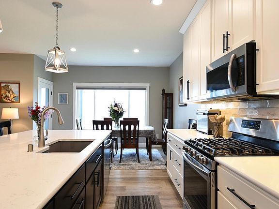 Stunning fully finished Ranch Style Home! This 5-bedroom 3-bathroom home features all of the extras you can dream of! This home features, open floor plan, large kitchen center island, quartz countertops, backsplash, stainless steel appliances, custom cabinets, corner pantry, eat in dining area, LVP flooring, oversized owner's suite with double vanity, walk-in closet, ceramic tile shower, window treatments, gas fireplace with built in cabinets, great room with trayed ceilings, main floor laundry with wash tub, built in lockers in mudroom and that’s just the Main floor! Lower-level walkout basement features 3 additional bedrooms, large family room with surround sound, built-in bar with Wine cooler, 3/4 bath with ceramic tile shower and great storage options. Exterior presents, fenced in backyard, 3 season maintenance free screened-in porch with patio below and a great view of pond life and northern skyline. Attached 3 stall heated & insulated garage. Move in ready is an understatement!