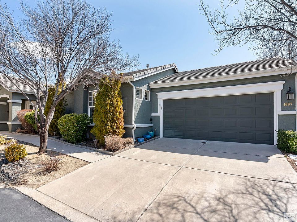 This beautiful, single-story home in Double Diamond features fresh interior paint and a charming backyard with pavers and a pergola. 1667 Iron Mountain Drive is move-ready and offers an ideal setting from which you can enjoy the spring weather. You’ll love the low maintenance lifestyle and incomparable amenities offered at Wyndgate Village!, Interior features include: formal dining room; functional kitchen with upgraded tile countertops, drop pendant lighting, gas range, and a breakfast bar; family room with ceiling fan and a tile surround gas-log fireplace with mantle and hearth; primary bedroom with ceiling fan; primary bathroom with dual sinks, shower stall and walk-in closet; two guest bedrooms, each with a ceiling fan; guest bathroom with tub/shower combo; and a laundry room with upper cabinets. Exterior features include; front landscaping maintained by HOA; prime location at the end of a cul-de-sac; and a private backyard with pergola and paver patio. Bonus features include: fresh interior paint; plantation shutters throughout; an attic fan; a whole-house fan; and a pull-down ladder in the garage.