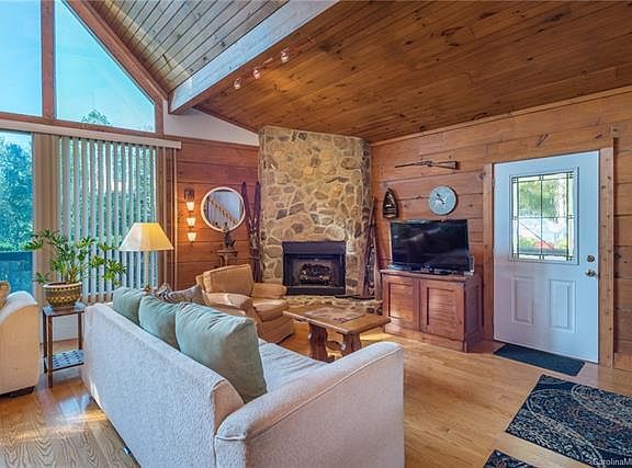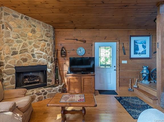 Beautiful log cabin features a mix of timber frame accents and large glass windows making it light and bright. Situated on large 4.17 acre lot with a small meadow, woods with trails and bordered by a creek. Upon entry to the home is the 2 story great room featuring floor to ceiling windows, vaulted wood ceilings and a stone fireplace. Comfortable kitchen with tall cabinets and pantry for storage, plus large eat-in bar with granite tiled top. Main level bedroom ensuite with 2 walk in closets and spacious private bath. Upstairs is a loft space great for relaxing with year round mountain views plus an additional guest suite with full bath. There is a wonderful wrap around porch where you will enjoy the fresh mountain air, beautiful trees, and plenty of nature and quiet. Located in Lake Adger Community with community parks and easy access to the lake for boating, fishing and swimming. Plus 13 miles of private community trails for hiking and horseback riding. Come make Lake Adger home!