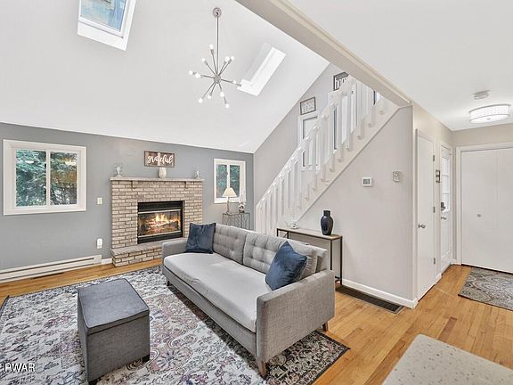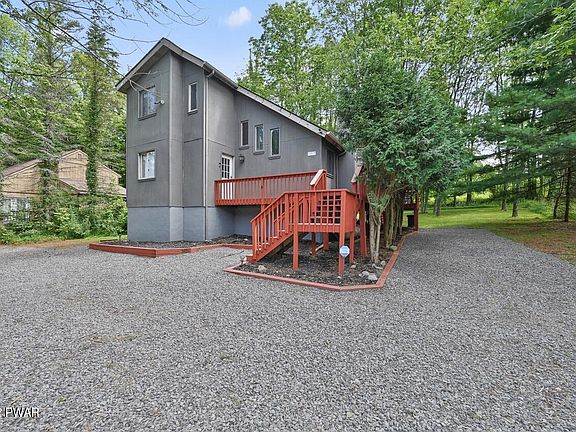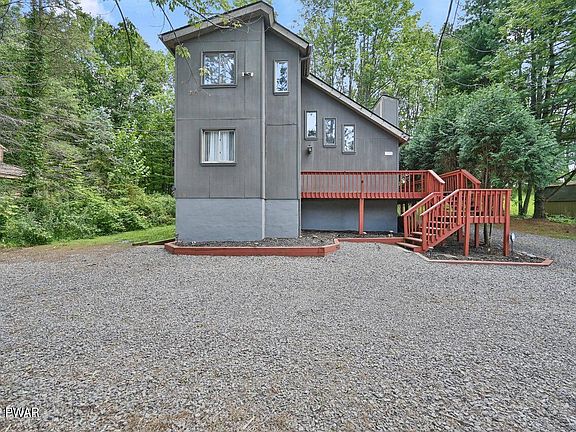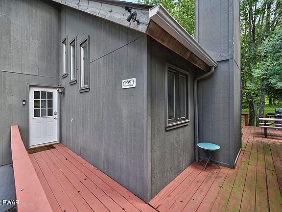 Fully furnished, beautifully updated home in a four-season amenity filled community in The Northern Poconos, just 2 hours from the NY, NJ and Philadelphia Areas. Located on a nice level lot with an inviting backyard. This 3 bedroom, 2 bath home has three finished levels. There's a large sunroom with vaulted ceilings and split unit with heat and A/C, access to the wraparound deck. Central heating with heat pump, Central A/C and three split units. The kitchen has been updated with quartz counter tops, and is open to the main living area with fireplace and high ceilings. The finished lower level has a large recreation room equipped with fun!