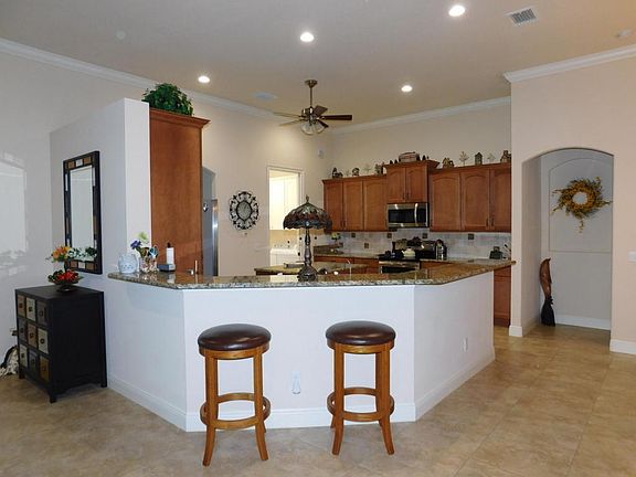 Three years old and better than new! Four bedrooms plus a den and three full baths. 30' x 30' detached garage with impact windows, finished ceiling, auto garage door opener. The house features impact windows and doors (with mini blinds), over-sized covered and screened porch, 11' ceilings in living areas, granite counter tops, full overlay soft close maple cabinets with pull-outs, volume and coffered ceilings, fully fenced yard, large driveway for the house garage and detached garage plus a separate 100' driveway for boat or rv. Summer kitchen with grill and mini-fridge. The backyard has a separate fenced area and brick paver decks. Complete gutter system for house and detached garage. Ceiling fans in all rooms and back patio.