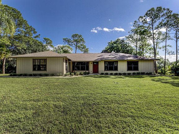 Beautiful 4 Bedroom 2 Bathroom Single Family Home in highly desired Jupiter Farms situated on a beautifully maintained 1.25 acre lot that is fully fenced and perfect for all your pets! Take in the open floorplan with a Gorgeous kitchen featuring white custom cabinets, granite countertops, stainless steel appliances, farmhouse sink, center Island with a skylight for extra lighting. Brand new vinyl wood flooring throughout entire house and new carpet in all the bedrooms, freshly painted throughout, new custom closets, vaulted ceilings, fireplace, Wine Cooler, brand new water heater in 2020, new water treatment system in 2020, Both bathroom have been upgraded in 2020. Sit outside in your screened-in back patio where you can enjoy beautiful views of your private and peaceful back yard The property also has a Storage shed, outdoor shower, tropical fruit trees and even a Fire Pit for fun! There is plenty of room for a pool, in law cottage, horses or a detached garage. This home features a large Family Room or Office (whichever fits your needs), split bedroom layout, nice size Laundry Room with even more storage space! Pride of ownership shows in this well maintained home. Close to I95/Turnpike, 5 minutes to Riverbend Park, 15 minutes to the beach and a short drive to shopping and restaurants all while living in a country setting. Horse friendly community with NO HOA! A MUST SEE! HURRY WON'T LAST!