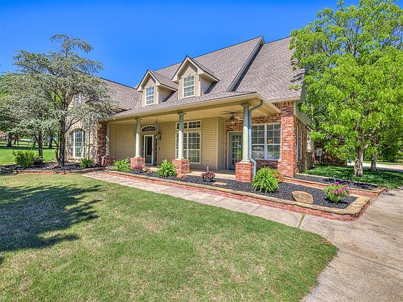 New and improved price on this stunning home situated on a cul-de-sac in the cozy Stonegate Crossing. You are welcomed in to gorgeous wood floors and soaring ceilings with a spiral staircase, and with over 4,000 sq feet of living space there is something new to explore around every corner. The living room features a stacked stone fireplace and a wall of windows to admire the outdoor wonderland. The chef's kitchen is complete with Cafe double ovens, 6 burner Jenn Air stove and gridle and a beverage area with its own wine fridges and coffee bar. This home is a true 5 bedroom, with an office and spacious theatre room, and that's just the inside! The outdoor space is an entertainer's paradise made to be enjoyed year-round. It comes with an outdoor kitchen complete with griddle and grill for your summer cookouts, and a stunning cedar pergola and brick fireplace to warm you on the chilly evenings. And don't forget the sparkling concrete swimming pool and hot tub perfect for relaxing and cooling off this summer. The stately brick fence offers privacy around your backyard amenities, but the generously sized acre plus lot leaves plenty of room for all your other outdoor enjoyment. This home offers an opportunity to leave the hustle and bustle of the city behind, but close enough to get to Tinker in 15 minutes, or downtown in 25. This home is luxury without the million dollar price tag. Professional pictures coming Tuesday.