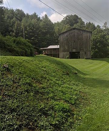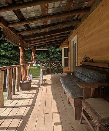Cabin like structure with rustic wrap around porch. Finished downstairs with tile floor, with carpet in the 2 bedrooms. Open main floor with master bedroom and bathroom.