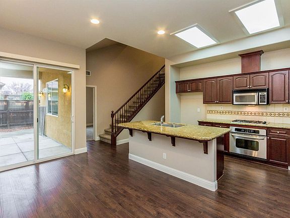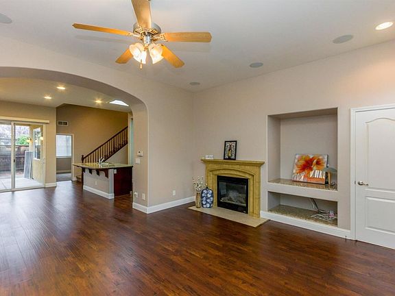 A stunning two-story Camden/European Collection built by Wathen Castanos in the prestigious Harlan Ranch Planned Community. Located across the street from Harlan Ranch Amphitheater with the picturesque clock tower. It's adjacent to club house with the junior Olympic size pool, green maze, playground & park with lined of Olive trees. Bud Rank Elementary School is a short walking distance. This Country French home has upgrades galore, from the full stone entry, granite countertops & island, stainless steel appliances, raised panels Kitchen Craft cabinets with Cherry Bordeaux finish, central vacuum system, Levolor wood blinds, ceiling fans, fireplace w/ blower, 5-1/4 baseboards, built-in speakers in Master Bedroom & surround sound in Great Rm, covered patio is prewired for speakers & ceiling fan, premium lot w/ walk-around side yards. It has been newly remodeled with beautiful laminate wood floor, new carpet in bedrooms & stairs, new 3-tone paint on walls & newly painted doors & trim.