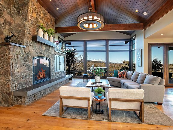 This luxurious custom home is positioned perfectly to capture a stunning view of 10 peaks and ensure maximum privacy. It sits on a premier lot adjacent to the Deschutes River Trail, surrounded by natural beauty in the North Rim community. The interior features soaring ceilings and expansive windows, complemented by rich beams and extensive stonework. The awe-inspiring kitchen is perfect for gatherings and seamlessly connects to an expansive covered deck, immersed in picturesque landscapes. Here, you'll find an impressive outdoor fireplace and seating area for year-round enjoyment. Custom cabinetry and closets are thoughtfully integrated throughout the home. For those with an active lifestyle, a custom-designed exercise pool awaits. In addition, the property boasts a heated driveway, 3-car garage, including an RV bay with an 11 ½-foot door. The residence is equipped with a Control 4 smart home system, ensuring modern convenience and security. This home truly exemplifies luxury.