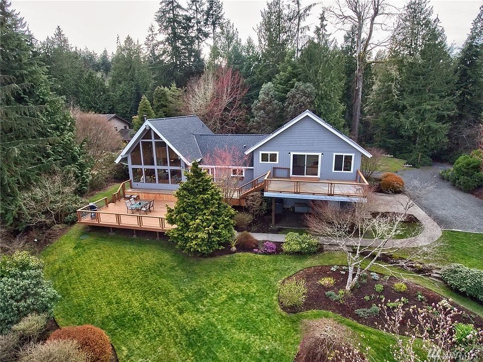 Bring offers!Enjoy the private beach, shared with 3 homes. Easy living custom with Sound & Mountain views. Huge multi-level deck and gorgeous gardens. Soaring ceilings in the great room. Library on the main, with French doors & beautiful view. Master up a few stairs. Great option for shared living. Upper area plumbed for a kitchen. Teak floors, view loft, new roof, new 3/4 bath, new appliances. 3 BR, 4 total baths. Usable loft! 2-car garage plus shop space. Shy acre, private lot.