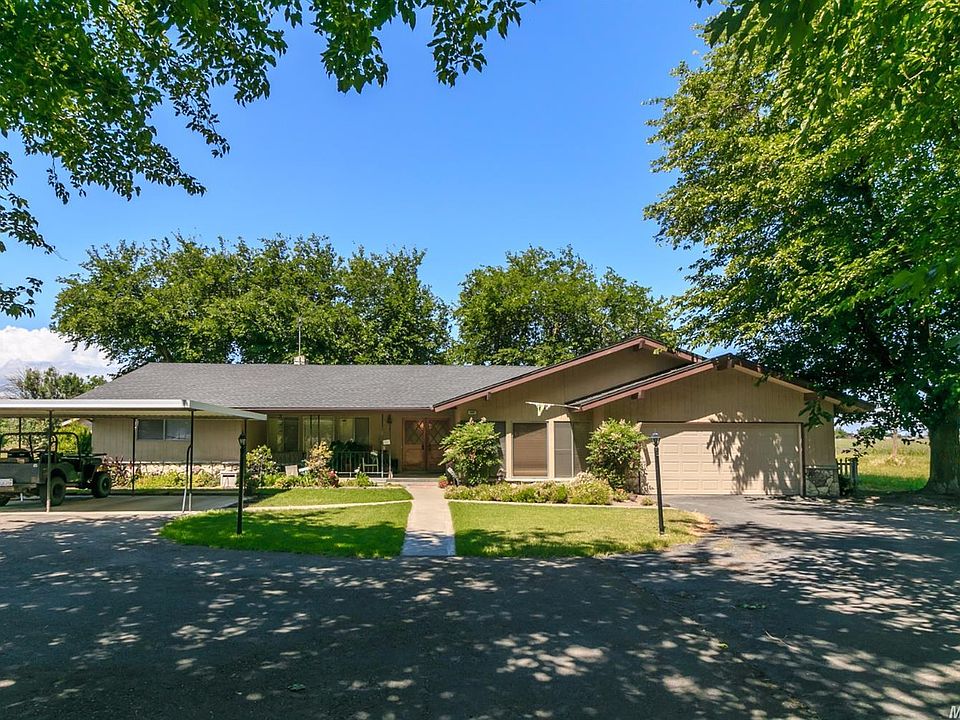Beautiful Ranchette on 8.27 acres featuring 4BD/2BA w/2154sf. Spacious floor plan w/separate living & family rooms. Family room w/cozy fireplace. Updated kitchen w/tile counters, stainless steel appliances & lots of cabinets. Indoor laundry w/sink & cabinets and good size storage room in backyard. Pole barn w/shop, another barn for storage, plus another smaller covered area w/small animals stalls. Water rights to CCID water and much, much more.
