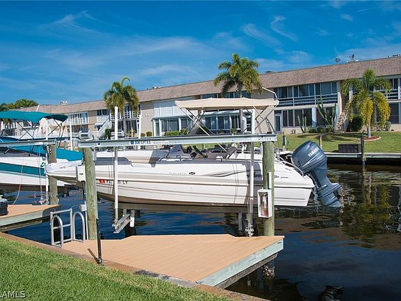 ATTENTION BOATERS & SALT WATER LOVERS! DIRECT GULF ACCESS, NO BRIDGES…MAGNIFICENT RIVER VIEWS! Super quiet, dead end location yet walkable to bars, restaurants and music venues! Unit #206 has updated kitchen and baths with new cabinets, GRANITE countertops and stainless steel appliances. Diagonal tile throughout except for bedrooms. Plenty of closets! BRAND NEW AC! Enclosed balcony offers additional indoor/outdoor living space. Well maintained, community pool has a paved deck. New Boat dock has water and electric available. The 10k capacity lift, exclusive to this condo, is remote controlled with an app.Boat can be purchased separately. Carport is deeded to this unit with plenty of additional guest parking. Rear staircase has access to boat dock and back yard. Washer & dryer in unit. Additional community washer & dryer just steps away. From your own living room, you can enjoy Cape Coral’s Red White & Boom July 4th firework display. BUY now for next season! Collect market rent from reliable tenant till December 1st.