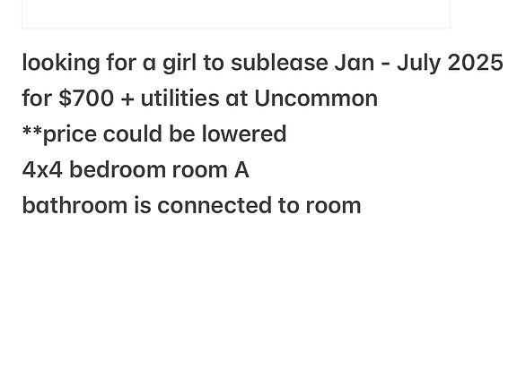 Within walking distance of UNR. Luxury apartments with great amenities. Private room shared with three other girls. Apartment is fully furnished. Need to sign sublease with me. The price each month will be $833 I will send the money each month to bring down the rent to whatever is agreed upon. Rent is due on the first of each month. Utilities are your responsibility. Lease is January 1st to July 31st.