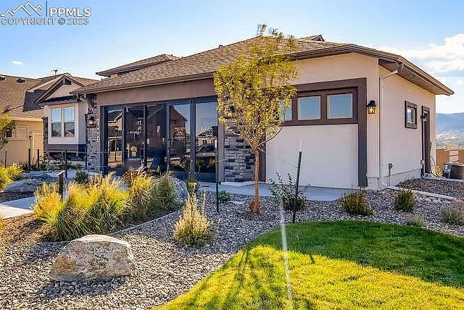 Builder model being offered as a leaseback. Hillspire floorplan in Jackson Creek North. Ranch style, 3 car, 5 bedroom, 4 bath home with finished basement. Handsome stucco and stone exterior. Home is currently being used as a builder model and offered as a leaseback. Insulated, finished garage has 4' forward extension to accommodate longer vehicles or provide extra storage. Designer layout kitchen features maple cabinets with a charcoal finish, Quartz countertops, corner pantry, stainless steel appliances including gas cooktop and refrigerator. The great room features contemporary style fireplace and walks out onto expanded deck with cover to enjoy Colorado rain or shine. Additional features include contemporary horizontal iron pickets at stairs, smart home package and air conditioning. The finished walk-out basement has 1 foot taller ceilings and offers a large rec room with wet bar, 3 bedrooms and 2 baths.