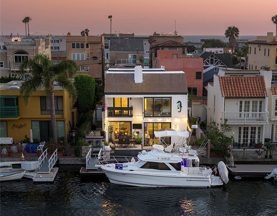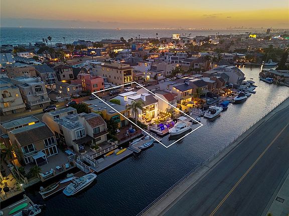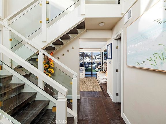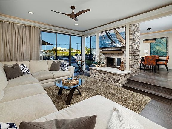Beautifully remodeled Huntington Harbour waterfront modern beach house with private dock that can accommodate to 40 foot boat. Dramatic entry with glass stair railing and wide wood plank floors greet you upon entry while the waterfront living and dining rooms are separated by a double-sided fireplace. Kitchen with quartz counters, under cabinet lighting and built-in eating area with additional storage. The wet bar and wine fridge are great additions for the entertainer. The primary suite features high ceilings with large view windows, beautiful fireplace and elegant bath with custom upgrades, dual sinks, walk-in shower and his and her closets. Two additional bedrooms upstairs with vaulted ceilings, shared balcony and a full bathroom. Large waterfront patio with BBQ island and drink fridge and firepit with built-in seating. Extra-wide driveway and the 2 car garage creates plenty of parking. Great location in the harbour, walk to Sunset Beach, shops, restaurants, etc.