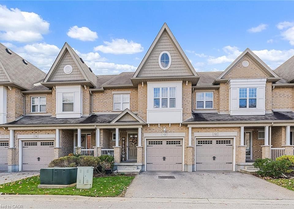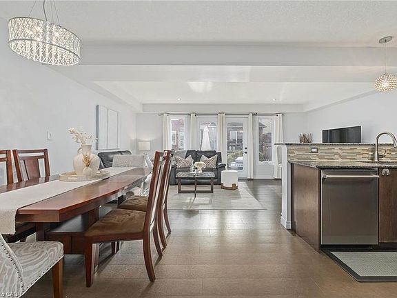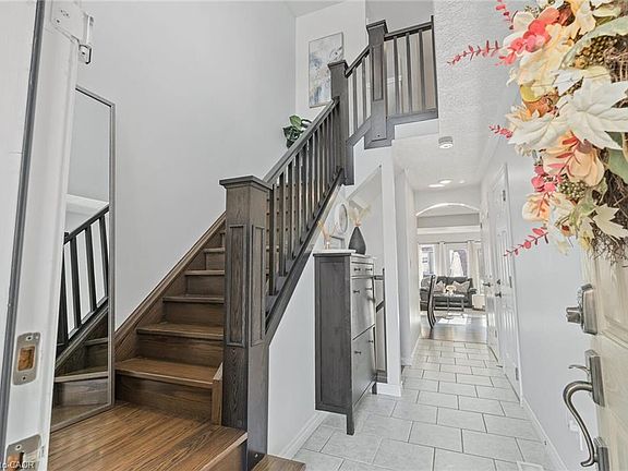 Open the front door, before you step inside, and let your eyes lead you straight ahead through the arched entranceway to a main living space overflowing with windows and natural light. As you step inside this home, you're welcomed by a soaring 17-foot ceiling that stretches from the main floor to the second level, a stunning architectural statement framed by extraordinary oak square pillars and beautiful hardwood stairs. Above, a modern light fixture draws your gaze upward, perfectly complementing the open, airy design. Continue through the open-concept living area, where you can easily walk out to your backyard patio perfect for BBQs, relaxing, and entertaining. At the end of the day, retreat to your primary suite with its 11-foot cathedral ceiling, striking chandelier, and three bright windows that welcome the fresh air. Cozy up on the built-in window bench and enjoy the best view in the complex, overlooking the trees. With an oversized walk-in closet, 3pc ensuite bathroom, second-level laundry, and spacious second and third bedrooms, there's room for everyone to live comfortably. The basement awaits your personal touch, complete with bathroom rough-in, oversized windows, and great ceiling height - the perfect canvas for your future plans. Located minutes from schools, parks, conservation areas, shopping, restaurants, and the renowned University of Guelph, this home blends design, convenience, and lifestyle into one exceptional address.