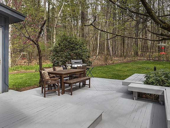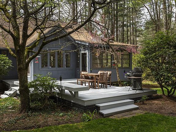 Set back 250' off the road in a lush, wooded setting, this stunning contemporary home offers abundant living space laid out in an open floor plan. Extensive landscaping that includes fruit trees, perennial beds, and shrubs, surrounds the home. Roomy 2-level deck affords room for BBQ and furniture. You're greeted by a 2-story foyer with skylight. Main level has a large living room with floor-to-ceiling stone fireplace, vaulted ceiling, and oak flooring, and blends into the formal dining room that benefits from the vaulted ceilings and custom windows. Spacious kitchen with contemporary oak cabinets, dining area, and vaulted ceiling. Off din rm and kitchen is a screened porch w/slate flooring. Master suite w/full bath; excellent sized secondary bedrooms - all with oak flooring. Lower level w/large, sunny fam rm and has stone hearth w/wood stove. Private corner office. Two-car garage under. Much of interior was recently painted, as well as exterior deck. This one is a winner.