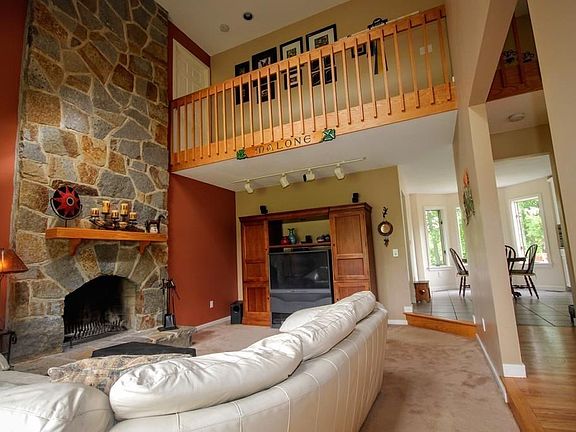 Lovely 4 bedroom, 3.5 bath Contemporary with attached 2 car garage on nearly 1.5 acres just minutes from downtown Northampton. Meticulously maintained with many updates. Two master suites! Brightened by skylights, the Living Room has a dramatic 2-story stone fireplace and cathedral ceiling. Gorgeous refinished wood floors flow through the open plan family and dining rooms, with access to the spacious deck and views of nicely treed and open grounds. The bright, beautiful kitchen with adjoining dining area was recently upgraded with granite countertops, new cabinetry. Upstairs the main master suite boasts an airy cathedral ceiling & pastoral views; master bath has a jetted tub, dressing area, wall to wall closet, granite double vanity and skylight. The 2nd suite has two closets + bath with shower - perfect for an in-law or teen suite. Two more bedrooms, another full bath, and a balcony with views of the living room complete the second floor. Close to Musante Beach, Look Park, Florence.