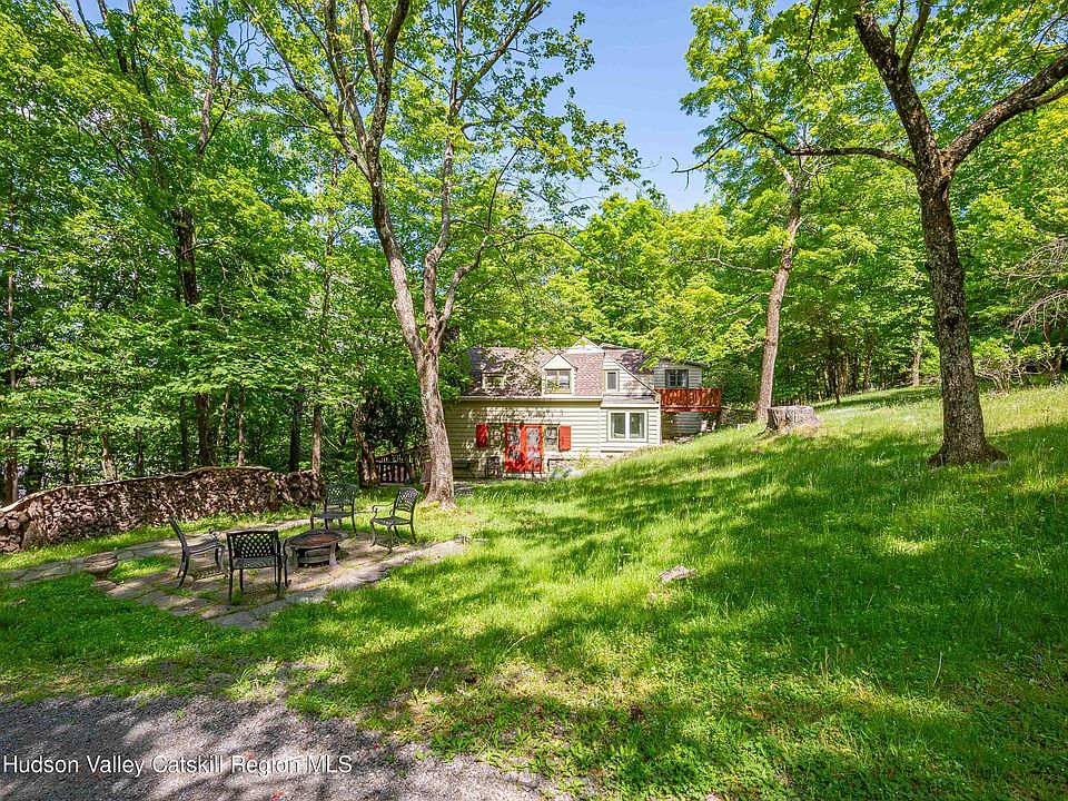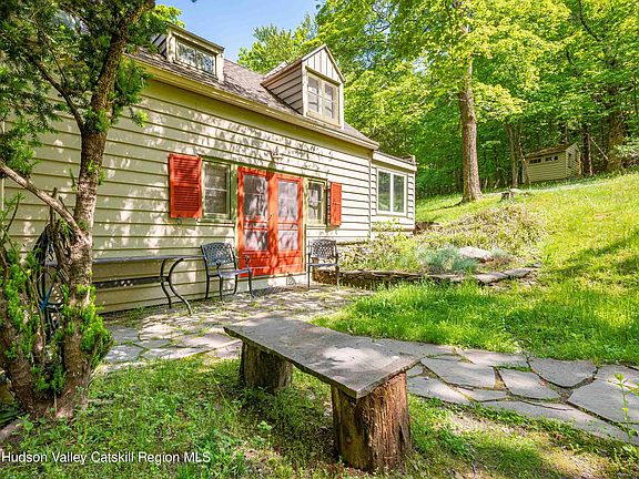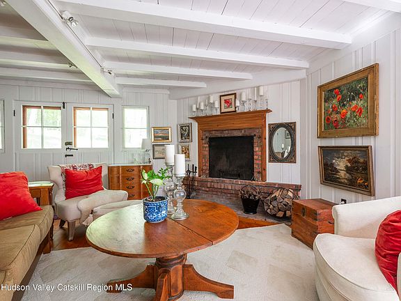 Come discover this Woodstock Broadview retreat for here is a perfect blend of classic charm and modern comfort. You will know that you are experiencing life in a home that captures the essence of Woodstock's creative spirit. The four bedroom home began in the mid 1800's and was renovated in 1930 by the famous Woodstock architect, Albert Graeser. In keeping with its historical roots, a substantial and tasteful large addition took place in the 1970's by the Ebbs family who were known as local artists and ''free-thinkers''. Nestled along the picturesque hillside on one of Woodstock's best country roads, the home takes advantage of nature's bounty and yet is only 5 minutes into the heart of the village. The artistically inspired residence has a multiple array of cozy living spaces each with its own unique allure. How wonderful it is during inclement weather to emerge into a generous and well lit entry, a great country ''mud room'' with its own coat closet. The dining room and recently renovated kitchen only a few feet from here. The cozy dining room has a classic wooden cupboard built in. The bright kitchen with skylight seamlessly opens to a series of intimate gathering areas, each anchored by fireplaces that promise visual interest and ambiance. An updated half bath is easily accessible for guests while entertaining. From the inviting living room with its unique raised fireplace to the dining room and a guest bedroom, each space offers its own charm. A screened porch off the private and spacious family room offers a serene escape where summer nights are accompanied by the sounds of hooting owls and breezes blowing through the leaves. From the second story, at the top of the stairs, there is a doorway that leads one over a little bridge directly to the lawn behind the house. This is just one of the charming idiosyncrasies and fun qualities belonging to this one of a kind home. The second story has two full baths and three bedrooms. Two of the bedrooms are off to one side, while the large and sizable primary bedroom appears to be two original rooms combined. Here you will find a very spacious newly remodeled bathroom! The home extends outdoors onto stunning living spaces including two bluestone patios and a deck which provide ample opportunity for outdoor entertainment or quiet reflection. All this sited on private lush acreage in an idyllic setting with the convenience of an ever evolving and vibrant town of Woodstock. A Better Homes and Gardens photographic article on display in the house from 1950 featured this home (prior to its addition in the 70's) and shows its great appeal back then. It has since been well loved, maintained and renovated over time making it even more of a true gem today!