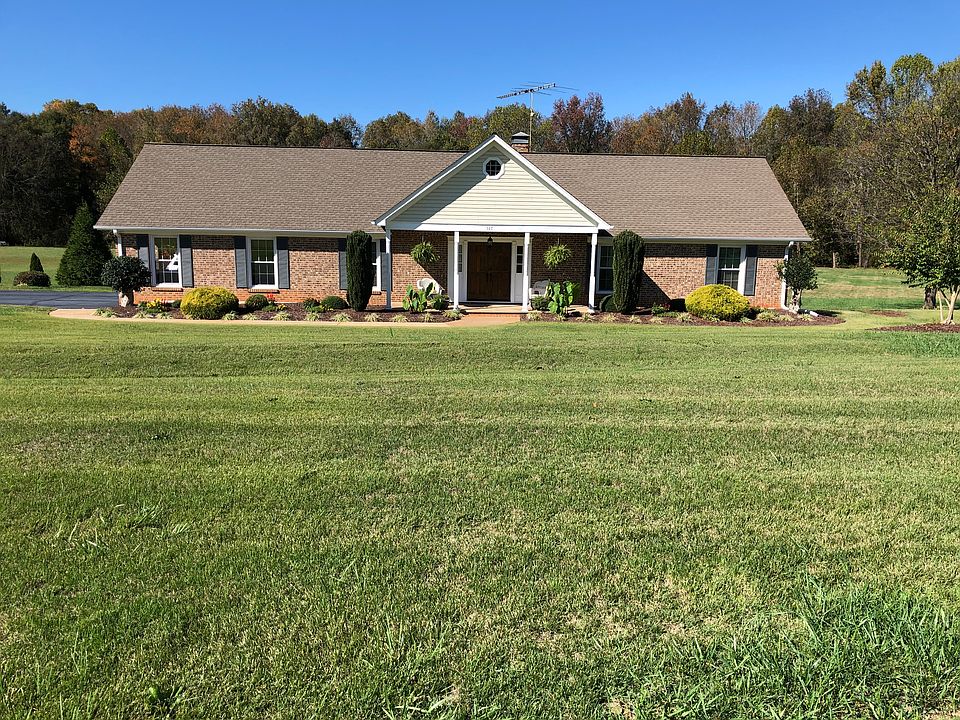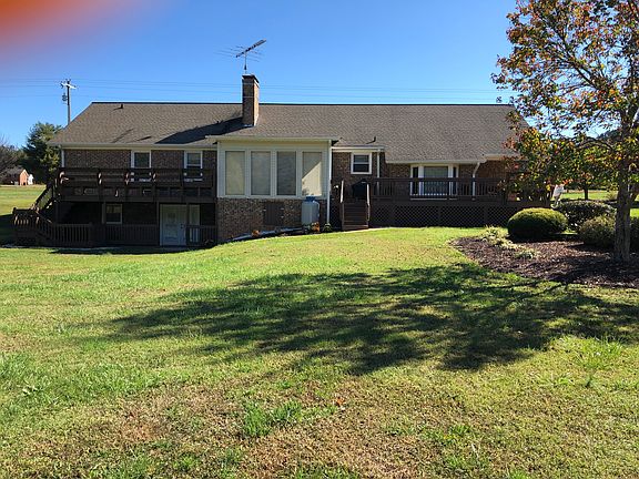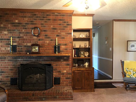 5.15 acres with creek and wooded area at the rear of the property surrounds the brick ranch home with a basement. Eat in kitchen has a walk in pantry. Greatroom has a wood burning fireplace with built in bookshelves. Home office can be an exercise or play room. Main level has the master bedroom with two guest rooms. The lower level has a large rec room that could be a guest room as it has a closed full bath. Detached garage/workshop (24x32) has a 14x32 Covered shed attached. (10x15) sun-room not included in SF.