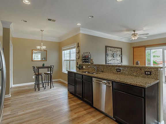- RoomKitchenFeatures: Granite Counters, Pantry, Recessed Lighting, Ceiling Fan(s), Eat-in Kitchen, Floors-Vinyl, Cabinets-Stained, Bar, Backsplash-Tiled