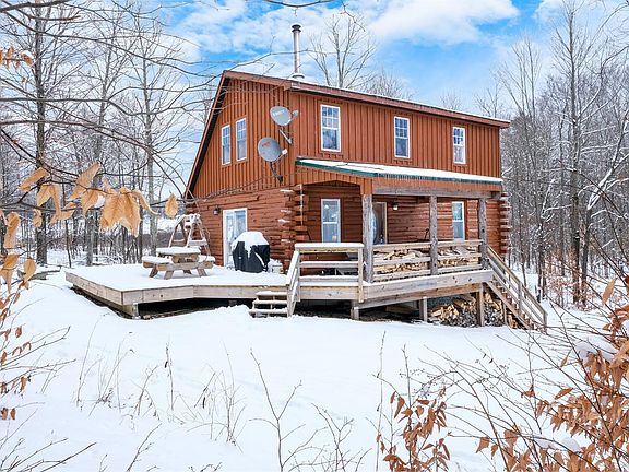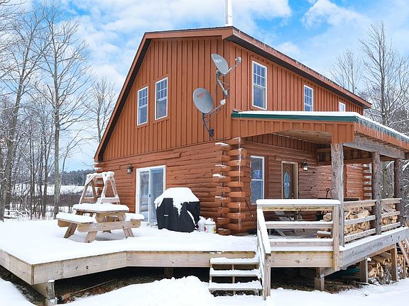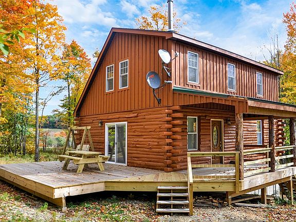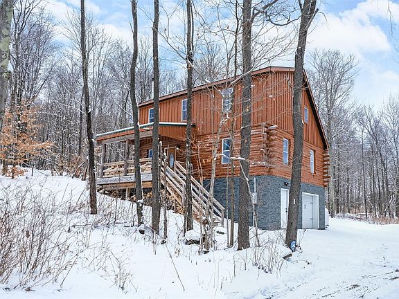 All-Brand-New-Custom LOG HOME Construction with a unique Rustic-Feel that is currently a successful 5-star VRBO business. Anchored by a Quadra-Fire wood-burning stove, with its stark black stack running the entire height of the 2-story cathedral ceiling, the open living / kitchen / dining space is spanned by huge wood beams. This same linear theme is echoed throughout other design elements in the home, like the custom open staircase to the 2nd floor and loft area which features horizontal metal rebar railings that provide safety and an open airy flow between the living zones.The 1st floor bedroom continues the open-beamed ceiling theme with knotty pine walls, while the second floor has a full bedroom with a whimsical sliding barn boor, plus a comfy loft. The luxurious full bathroom offers classic comfort with a modern flair -- double sink with marble top, stand-up quarter-round shower, plus a 17-jet Whirlpool tub to relax your stress away.Entertain your friends and family in comfort and style in this new cabin retreat. With over 5 acres of wooded play-land on a town-maintained dead-end-road there is plenty of room to spread out and explore. The half-wrap around deck is partially covered for those days when mother nature threatens to keep everyone inside, and the other half is open to the back yard for a safe and secure playpen for dogs, and kids of all ages. Grill to your heart's content, no matter the weather! Turn up the music, if you like, the neighbors are too far to disturb. Or simply relax and read a book, watch a movie (Spectrum Hi-speed cable is available) or just reconnect with those you love in the peace of this beautiful woodland modern-rustic log cabin.Surrounded by all the Great Western Catskills has to offer: Skiing, Boating, Snowmobiling, ATV Riding, Hunting, Fishing, Hiking, Mountain Biking, Cross Country Skiing, Music, Theater, Restaurants. Use the cabin as you base to explore. Minutes to Worcester and I-88, then to Oneonta, Albany, or Binghamton.