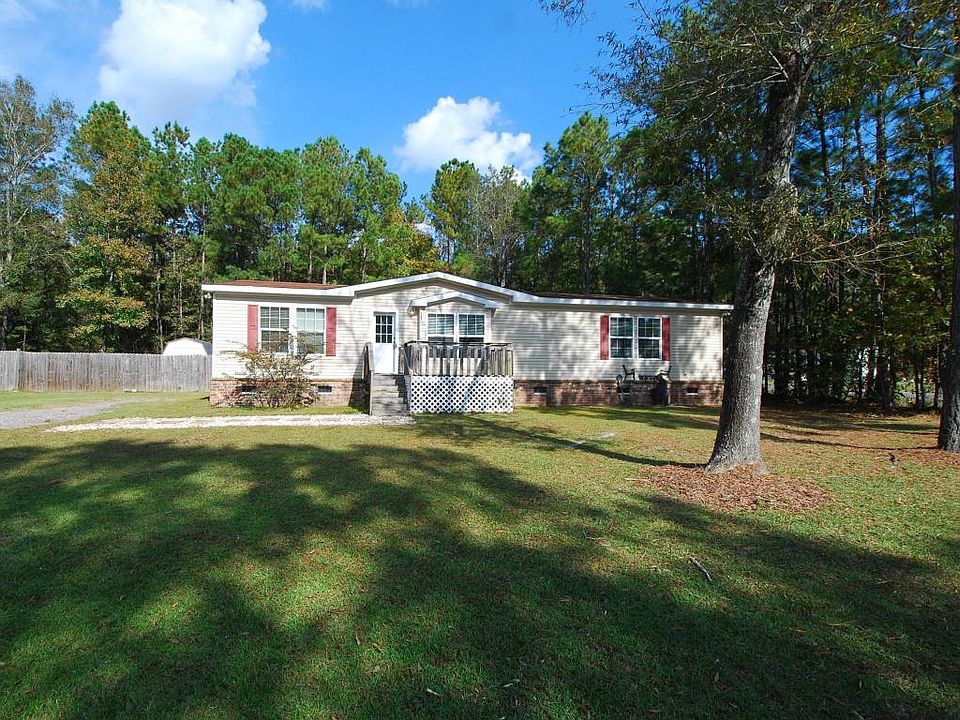 Almost ?HALF AN ACRE, CORNER LOT and OPEN FLOOR PLAN!!?! Brick under skirting?-? FHA approved Foundation. NO HOA!! MOVE IN CONDITION!!!! Fresh paint makes moving in EASY. Absolutely no carpet throughout the entire home! Six foot wooden privacy fence? with drive thru, double gate,? surrounds entire backyard. Vinyl?,? double fold-down?,? hurricane-resistant?,? windows?. Both windows and foundation tie down are rated Zone 3.?Walls are drywall.E??xtra large ?kitchen ?offers? abundance of cabinets and miles of counter-tops. ?Flat top range and matching dishwasher go perfectly with the glass cabinets and built in buffet area. PERFECT for Holidays!! Eat in kitchen has room and HUGE soaker tub. Back yard has 10 x 12 stone patio and a 10 x 10 storage shed for all your gardening needs.