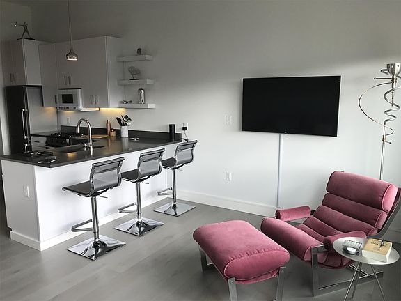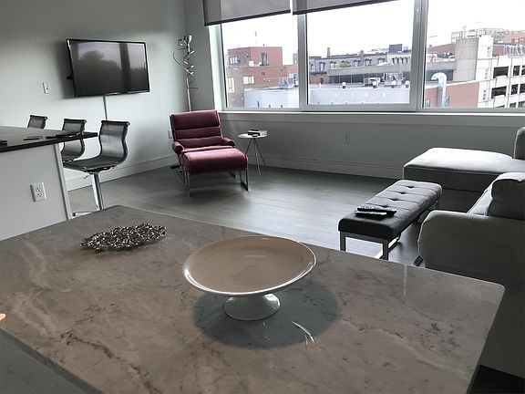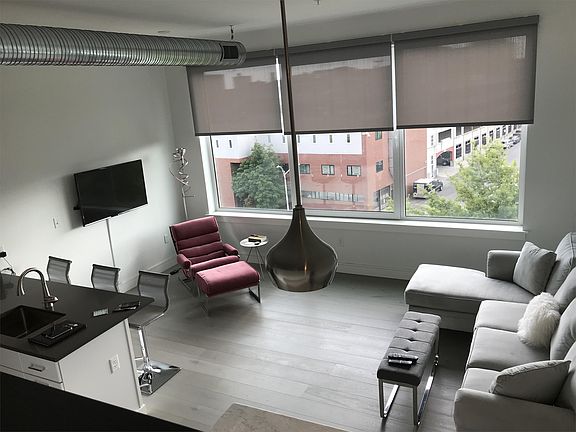 Fully furnished, light and bright modern loft style apartment in high end condo building with expansive views of Portland in sought after East End's India Street neighborhood. Shared building amenities include access to a rooftop terrace with views over Casco Bay, fitness room, and a lounge. One off street garage parking spot included, bike storage, and ample storage around platform bed. Tenant pays electric and gas. Washer and Dryer in unit.