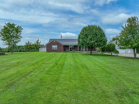 If you are looking for a home that was built with comfort and family in mind, this is it! Welcome to a gorgeous all-brick home, perfectly situated on almost 4 acres of land. The property is beautifully landscaped with multiple fruit trees, shade trees and flowering bushes. You can enjoy the farmland views from your large covered front porch. Once you enter the home, you are immediately welcomed to the massive living room with hardwood floors that flow into the rest of the main living areas. A large dining area that is open to the living room makes it great for entertaining. The kitchen has magnificent custom cabinetry that was built to last! On one end of the home, you have two spacious guest bedrooms with a full bath. The other end of the home has two master bedrooms, each with their own ensuite. One of those having the walk-in bathtub for an added benefit to some. This home has geothermal heating and cooling for extra efficiency as well. Too many other amenities to list. You have someone that needs a large garage/shop? It has a nearly 1,000 sq ft detached garage that has electric and even a small kitchenette for your convenience.