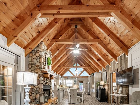 Very well-maintained log home perched along a circular drive on 3.1 wooded acres. This true log home is an entertainers' delight with multiple gathering areas for all your friends and guests including an inground pool, ample wrap around porches and decks, a pergola, a screened gazebo, hot tub, firepit area and a creek running all along the back of the property. The main floor comprises an open great room with expansive beamed ceilings, a wall of windows, and a gorgeous river rock fireplace and all open to the dining and updated kitchen. Two private primary bedroom suites with baths are also located on the main level. The terrace level offers an additional sleeping room with bath, large den/game room with a second river rock fireplace, laundry area, and opens out to a large screened covered patio overlooking the inground pool. A detached 2-car garage with workshop area, carport and a studio/guest suite located above the garage with a full bath and a mini kitchenette complete this exceptional property, ideal for short-term rentals. And deeded lake access trail to Lake Blue Ridge. This one has it all and more just minutes from downtown Blue Ridge and accessible to the many outdoor recreation areas including Lake Blue Ridge, the Chattahoochee National Forest, hiking and biking trails, and more.