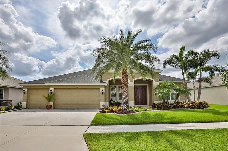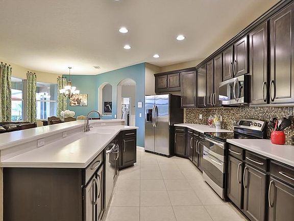 Welcome to resort style living at Harbour Isles! Pride of ownership here of this 4 bedroom, 3 bath, 3 car garage home. Meticulous landscaping with plenty of added palm trees that walks you up to the homes front porch with double entry doors. The minute you enter you see scenic water views and realize this home has it all. Spacious formal living and dining room with tray ceiling, wainscoting walls and entry to lanai. The kitchen has upgraded cabinets with crown molding, stainless steel appliances, double oven, separate faucet @sink for filtered water, back splash, separate dinette area for added eating space. Spacious Master bedroom with access to lanai, pocket doors to enter master bath. Master bath has double sinks, garden tub/stand up shower with pocket door to enter walk in closet. Separate laundry room with built in counter for washer and dryer. Recessed lighting and ceramic tile floors throughout. All bathrooms upgraded with taller cabinets for higher vanities and upgraded mirrors. Jack & Jill bathroom between two bedrooms for added convenience. The screened in lanai has been extended for added entertaining room and has direct access to the "pool bath" with a stand up shower. The 5Ft fully fenced over sized yard has an irrigation system ,a fire pit and commercial quality playground/play house that's UV protected. This home also has Hurricane Shutters and a Security System. The community has a Pool, Fishing pier, 1500 sq ft Fitness center, Playground,Basketball/Volleyball court, RV/Boat Storage too!