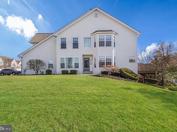 Warrington Hunt end unit Townhouse with private side entrance. Open two-story foyer features hardwood floors and accent columns separating the formal Living room from the dining room Formal living room with oversized picture window, crown moulding and neutral carpet. Formal dining room off foyer with bay bump-out window, crown moulding and chair rail with neutral carpet. Family room off living room with corner gas fireplace opens to the bright and sunny kitchen which features corner sink, stainless steel dishwasher, built-in microwave and solid raised white cabinetry. Eating room off kitchen with hardwood floors, slider to rear custom Trex deck with new custom rails. Open 1st floor concept with Family room & Kitchen open to Living room & Dining room. First floor hallway with powder room and entrance to 2 car garage. Open 2nd floor landing with open rails overlooking 1st floor formal entry. Private master bedroom with double door entry to Spacious Master Bedroom with cathedral ceiling & ceiling fan, bump-out bay window and neutral carpet and 2 walk in closets. Master bath features cathedral ceiling with tile flooring, tile walls, his and her sink, stall shower and soaking tub. Second bedroom and third bedrooms with ceiling fans. Hall bath with tub/shower. Convenient upper level laundry. Full walk-out basement. Oversized deck. Great corner property.