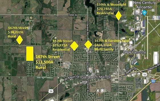 BEST BUY IN GARDNER!! 79.88 acres currently zoned Rural - Perfect for single family homes - Subdivision on the South side of property and subdivision on the North side across 167th. Blacktop Roads. Rural Water District 7 has an 8 inch water main along the north side of 167th Street. Close to Madison Elementary - Pioneer Ridge Middle School - Gardner/Edgerton High School.