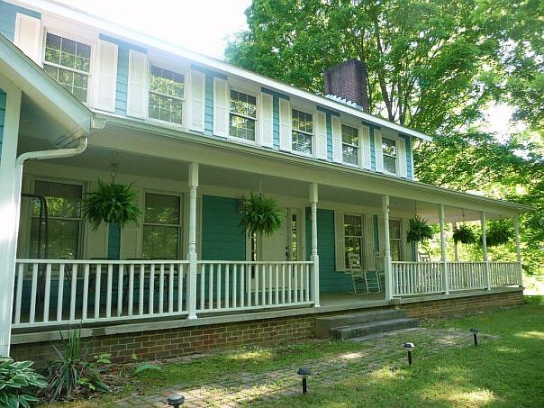 Rural Potential bed & breakfast... or family farm. Amazing windows allowing light & providing views all around of wooded yard & surrounding hills. Pastures surrounding house.Historical out building from earliest beginnings of this property which was once a dairy farm.Gorgeous country living... with wrap around porch in front & on side plus 2 decks in the back.Country living at its best!