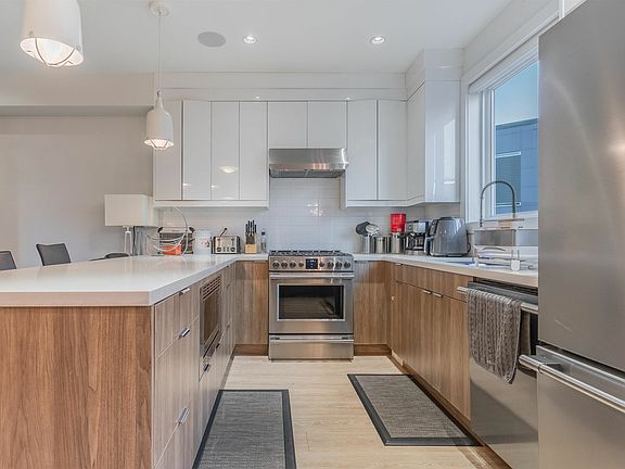 A premier townhome complex by Mortise Group. This LIKE-NEW 3-level townhouse features 4 Bedrooms + 4 Bathrooms, contemporary design elements including quartz counters, Frigidaire S/S appliances, gas range, fireplace, wide-plank laminate flooring, & airy 9' ceilings. Home is equipped with A/C, built-in Control4 bluetooth speakers on all floors & a central vacuum. Covered patio w/gas hook-up off the kitchen area in perfect for BBQing+ entertaining. Double garage offers epoxy flooring + bonus storage room. EXCEPTIONAL PRIVACY! No neighbours front or back! Lovely fenced backyard. Central location, close to grocery stores, schools, parks, restaurants & more. Easy access to King George Blvd, Highway 99 & Canada/USA border.