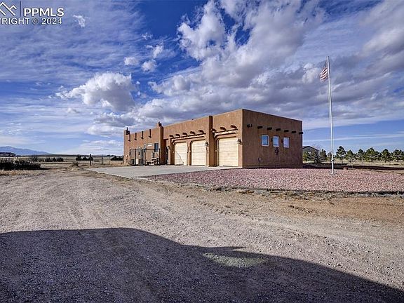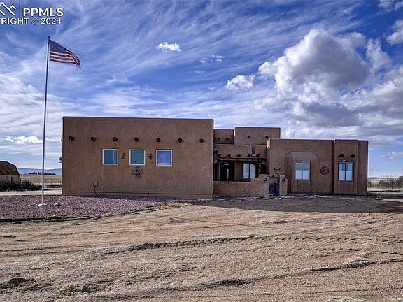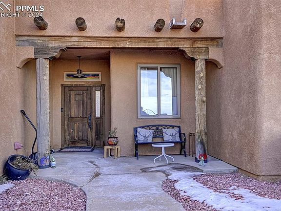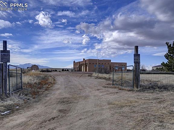 Exquisite Southwest style home on 35.8 acres. Million dollar views of Pikes Peak, Cheyenne Mountain, the Sangre De Cristos and front range. Equestrian property that borders a second Equestrian development, both with miles of riding and walking trails. Home features 10' and 14' ceilings with large wood beams, posts, Kiva fireplaces and hand textured finish. Abundant storage in the kitchen, dining room, and master suite. Gourmet center island with double oven and stainless appliances. Access to a rear patio from the living room, kitchen and master suite. The master suite is spacious with a walk-in-closet, 5 piece bath, sitting area with Kiva fireplace. Tile floors throughout with energy efficient radiant floor heat. Home also has an automatic self-sufficient whole house generator. Oversized heated 3 car garage which includes a spacious mudroom with sink, toilet, and shower for people and pets. 40'x60' red iron metal barn and shop. Has 110/220v electricity, water for horses and livestock, RV parking, open shop plenty of room for all of the toys. Property is completely fenced for livestock. Come live in your own personal oasis of country life. New windows, new and top down/bottom blinds, the landscaping, irrigation system and refrigerator. The shed is wired and has electricity. Over 75k in upgrades since 2021. New paint and stucco 2/2/2025.