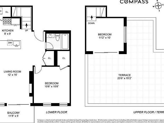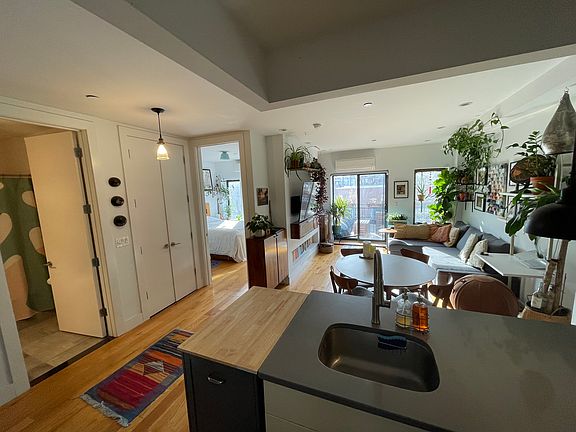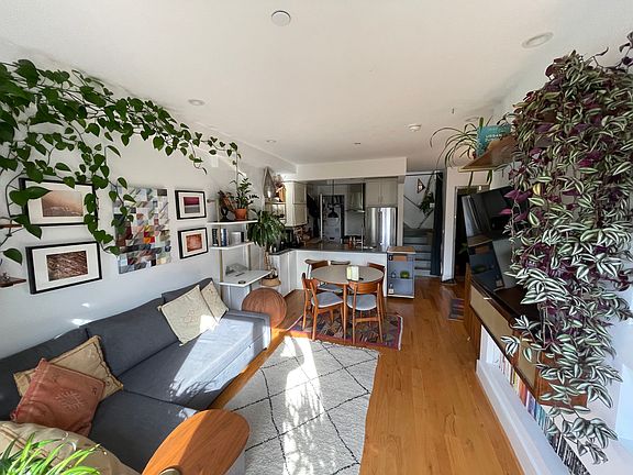 A sun-drenched WFH dream! This is a 2-bed, 1-bath duplex penthouse apartment with ample outdoor space and year-round daylight. Amenities: With all south-facing windows, the apartment gets plenty of sunlight all year long. It has TWO outdoor spaces: a large balcony on the lower floor, and a private rooftop terrace on the upper floor. The interior is well-appointed; it has a dishwasher, washer/dryer, walk-in pantry and virtual intercom to easily let in guests + deliveries from your phone. Bedroom 1 is on the main floor, and Bedroom 2 is upstairs, with access to the roof terrace. The unit has zone heating and AC, allowing for energy efficiency. This apartment is on the 4th and 5th floors of a modern walk-up building. The building has a basement with shared bike storage and a lockable storage unit for the apartment. This storage unit is available to rent for $150/month. The Area: The apartment is a 6-minute walk from the Utica A/C train and a 10-minute walk from the Utica 4/5 train. St. Johns Park is nearby with a track, wall ball, and other sports facilities. There are also 4 Citibike docks within a 2 block radius to enjoy restaurants on Franklin, or take a jaunt down Eastern Parkway to Prospect Park. Some other perks: We can leave the already-installed TV if you like. The kitchen carts pictured in the kitchen can also stay for additional counter space. We currently have Bedroom 2 set up as an office. The office has a built-in desk big enough for two and ample cabinet storage. We can leave the desk and cabinets, or we can remove them if you want more flexibility with that space. Some outdoor furniture will also be left for you to enjoy! *FARE Act Listing Disclosure Fees to be paid by Tenant: - Rent: as listed - Security Deposit: equal to one month's rent - Basement storage unit: $150/month (optional) - Insufficient Funds Fee: $175.00. - Renter's Liability Insurance: Tenant must provide own $100k+ liability policy) - Pet Deposit (due if Tenant declares a pet): $500 (refundable deposit) - Cleaning fee upon move out: $250 - Utilities: Tenant responsible for electric, gas, internet, and cable. Note: We have not engaged any agent nor hired any broker to market, advertise, nor lease this apartment.