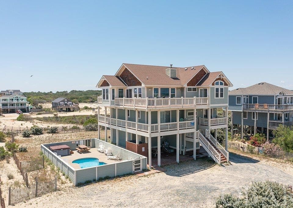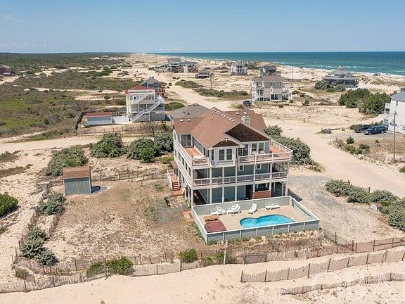 EXQUISITE "LUXURY" BEACH LIVING. This "WELL MAINTAINED" stunning home is topped off with the most magnificent Sunrise views of the Atlantic Ocean and Sunset views over the Currituck Sound. Located on the ever sought after 4X4 Beaches of Corolla, Also home to the Majestic "Wild Ponies" and numerous other species of wildlife. This is a custom design, open floor plan with high ceilings, three levels of living space, and a large "Theatre Room". Each bedroom boasts it's own private bath and generous closet space and balconies. Although not installed, there is a custom area specifically built to add an elevator if desired. This home is nothing short of pure perfection...A must see to appreciate!! Once outdoors, enjoy the large private in-ground pool and backyard area or take a short walk to the beach. Would be great for everyday living, a second home OR continue using as an investment property that has a proven track record of terrific rental income. LOCATED IN AN "X" FLOOD ZONE...WHICH MEANS...NO FLOOD INSURANCE REQUIRED!!!