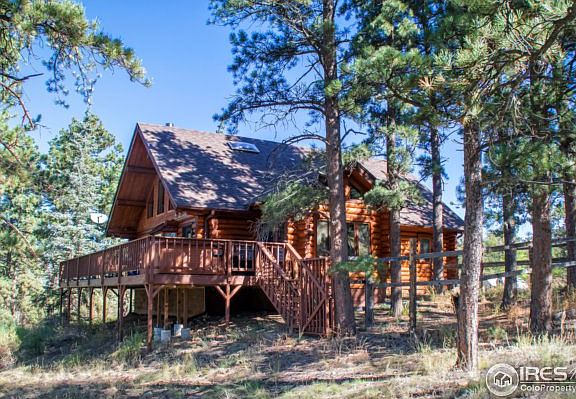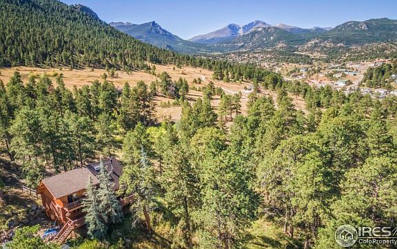 Gorgeous remodeled Log Home with picturesque Longs Peak/Meeker views, private setting in the trees on 1.92 acres. Wood floors throughout,updated kitchen with large island,updated baths, vaulted ceilings,efficient catalytic fireplace. Main level with 2 large bedrooms, one bedroom used as family room or bedroom, full bath. Upper with family room loft, master suite with private deck. Lower area with rec room,office space with outside entry.New 50 year shingles and gutters in 2016, kids tree house.