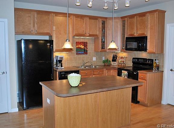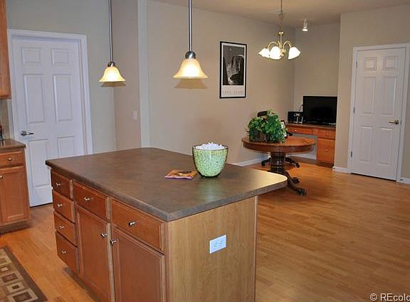 Strikingly upgrade, this 2 bedroom, 2 bath home features an stunning kitchen with stain maple cabinets with glass inserts and crown molding, brick-set tile back splash, pantry and island with breakfast. Engineered hardwood flooring on main living space. Large family room with media niche and electric fireplace. Covered balcony for grilling and dining. Generous master bedroom can accommodated most bedroom furniture. Master bath has large walk-in closet, linen closet, dual sinks and oversize tiled shower. Direct access to 1 car garage. Across for park. Low-maintenance living. Minutes from Park Meadows Mall, fine dining, entertainment, and outstanding recreation. Vast open space surrounds this inspiring community; miles of trails and 39 acres of parks, pools and picnic areas just by stepping out your front door.