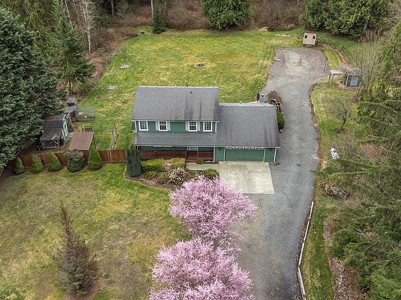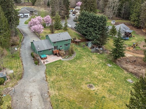 Enjoy the privacy of this 2.3 acre, well maintained 4 bed, 2.5 bath home. As you approach the home, you’ll be enchanted by the beauty of the wilderness around you. Escape in the peacefulness of the well sunlit yard. This large lot boasts blossoming fruit trees, pine trees and a large glacier rock. Back patio includes a custom built propane fire pit and a hot tub, great for entertaining. Inside you will find a freshly painted floor plan, including two living spaces, each with their own heat sources. Kitchen with eating area and separate formal dining area. The upstairs bedrooms offer ample closet space. Generator wired to electrical panel for emergency power. RV parking with a power supply or turn the usable space into your dream shop.