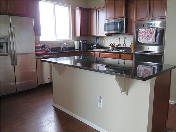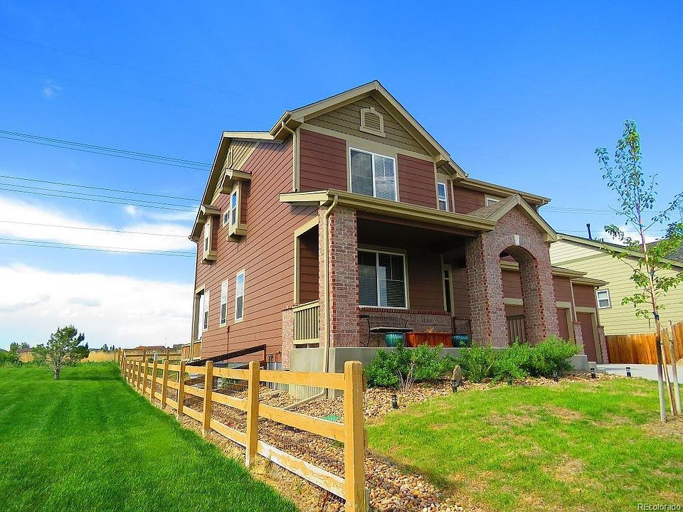 Enjoy awesome mountain views from your back yard. Open space behind and on the side of home make for a private entertaining area. Built in 2014, this beautiful home has many special features including but not limited to a 4 car garage (one is a tandem), double fireplace, wood (engineered) floors on main level, kitchen island, granite countertops. All stainless steel appliances stay, even the refrigerator. Washer and dryer are included. An unfinished basement provides plenty of storage. Don't worry about the commute because it's conveniently close to 104th, 85,86 and E-470 and only about 15 minutes to DIA airport. Parks and schools are in walking distance. Close to Buffalo Run golf course and Prairie View Shopping. You will enjoy this great home!