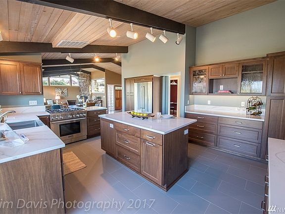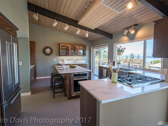 Fabulous 5 bed/2.5 bath corner lot w/awesome views! Great entertaining home w/Rec Rm/Wet Bar, A/C & Pool! Thoughtfully laid out in open concept & remodeled w/many updates: New kitchen w/gorgeous quartz counters, custom cabinets, farm style sink & SS appliances; Upper level w/Brazilian Teak flooring ; Lower Lvl w/cork flooring & new carpet, new paint, Cat 6 Wiring; plenty of storage; ample parking; sunny pool; huge deck looking north to Vashon, Beautiful view of Sound, Blake Isl & Olympic Mtns.