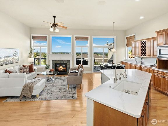 Privately nestled at the top of Woodside at McGarvey Park backing 400ac of forest framing 5 miles of trails. Vaulted, welcoming interiors & unmatched livability: MAIN FLOOR OWNER SUITE AND 2nd bedroom by ¾ bathroom & upstairs bonus room for games. Fun, social neighborhood w/summer & holiday events, 6 fantastic community parks just steps away, disc golf coming. Gorgeous kitchen w/warm cider cabinets, statement 50k BTU Italian range, new quartz, pantry. Great room opens to 600sf deck w/hot tub has unobstructed VIEWS of Seattle skyline, Olympics, sunsets & fireworks! Rich hues of stacked stone, hardwoods, travertine, quartzite, tall ceilings, classic millwork. 3-car garage, Tesla EVC, A/C, healthy furnace UV filtration. New roof/furnace/paint