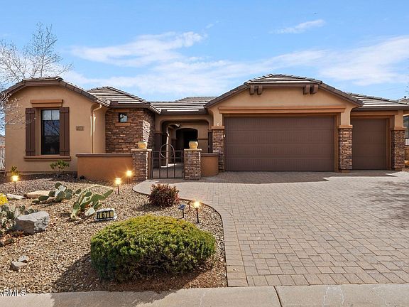 Gorgeous Prescott Lakes home on premium view lot. Minutes from downtown, shopping, golf trails. This bright and airy 2445 sf home with 3 bedrooms and 2.5 bathrooms is located next to common area. Custom upgrades, including: stone accented fireplace, decorator/media niches, porcelain tile, laminate flooring, Kohler fixtures, granite counters, maple cabinets, recessed lights. Contemporary Great Room plan is entertainer's dream w/ surround sound, a kitchen island, formal & informal dining, butler pantry and pantry. Split floor plan with a unique flex space between guest bedrooms. Covered patio w/ surround and w/gas stub for BBQ. Tesla Solar System & Tesla Charging Station in the spacious 3 car garage.