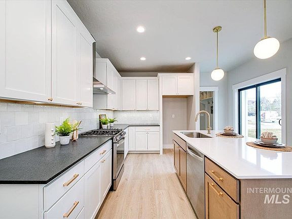 Low maintenance luxury steps from downtown Eagle yet tucked away from traffic in a quiet community! Outdoor enthusiasts will enjoy the covered front porch & private side courtyard which border common areas offering more greenspace & privacy. Situated on an end lot, an abundance of natural light fills the open floorplan. You’ll love the main level office in addition to the 3 generously sized bedrooms. This stunner boasts 9’ ceilings, LVP floors, premium black sash windows, dove-tail soft-close cabinets w/ under cab lighting, quartz counters, brass fixtures, upgraded SS LG appliances (air-fry oven!) w/ upper range hood, walk-in pantry, fireplace w/ tile surround, custom molding accents throughout, full landscaping, deep alley-load garage, Nest thermostat, & more! Perfect for lock & leave living or investment opportunity. Near downtown, an easy stroll to great restaurants, Eagle Sat Market, Guerber Park, Boise River Greenbelt, Eagle Hills Golf Course, or hop on nearby HWY 55 for quick escape to mountains!