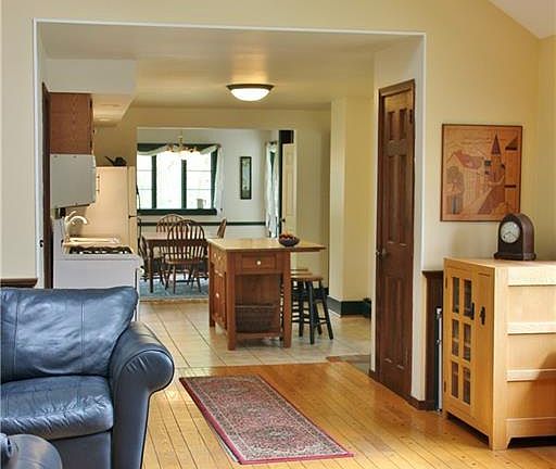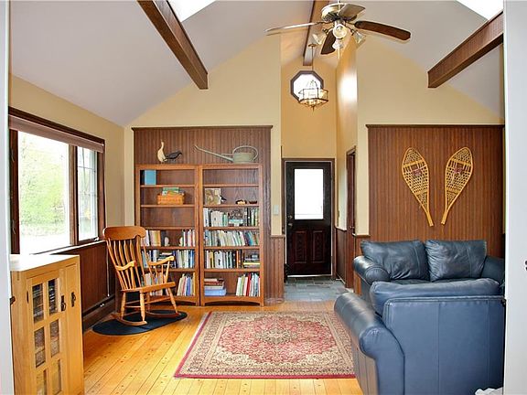 Charming home boasts wood floors, stairwell & trim. Wood fireplace in Great Room accented by stone wall. New addition of enclosed front porch offers even more great space off spacious Living Room. Maple & fruit trees are some of what make yard beautiful & private.
