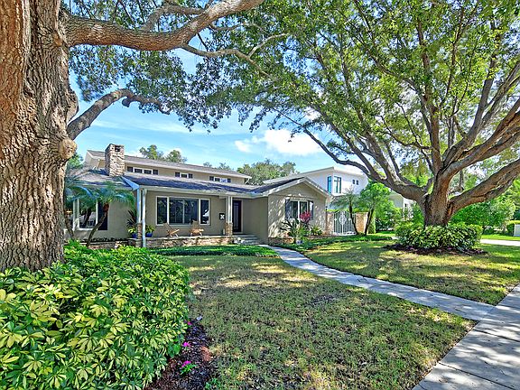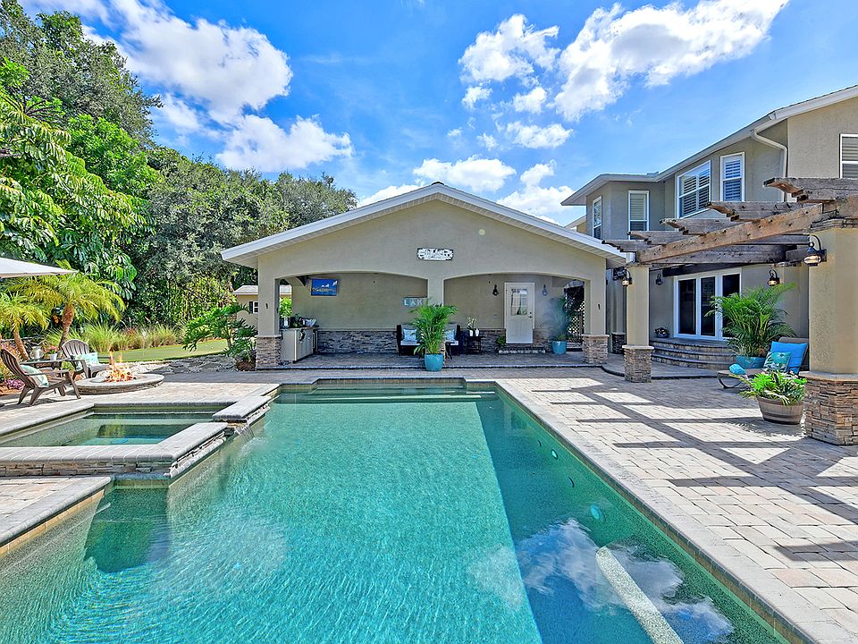 Spacious 5-bedroom family home in a perfect Sarasota West of Trail location - a genuine gem in highly-cherished Cherokee Park. Nestled under the canopy of mature oak trees on 1/3 acre, the buyer will appreciate this home's ability to embrace family and friends. The formal living and dining rooms provide elegant spaces for entertaining. The heart and soul of this home is the very large, very open, very connected kitchen + family room + outdoor living + pool area. The kitchen features Wolf 6-burner gas range with convection oven, Sub-Zero refrigerator/freezer, Marvel under-counter beverage refrigerator, beautiful solid-wood cabinets with granite countertops, eat-in island and adjoining family dining area. Step down into the oversized, 28x17 family room with 8x8 alcove, stone feature wall and French doors to the pool. The entire living area has clean lines, sleek profiles and conveys a transitional aesthetic with contemporary flair. For privacy, this home has 5 bedrooms - 3 on the first floor and 2 on the second floor with exterior stairs and entry. Outside, the large heated pool/spa is surrounded by a brick paver deck to keep maintenance to a minimum. Gathering areas include a covered patio with outdoor kitchen, in-ground gas fire pit and pergola-covered lounge space. For added fun, a practice putting green is steps from the pool. Inside and out, the buyer will enjoy this home's uniqueness and livability, and will certainly treasure the location.