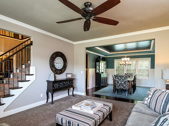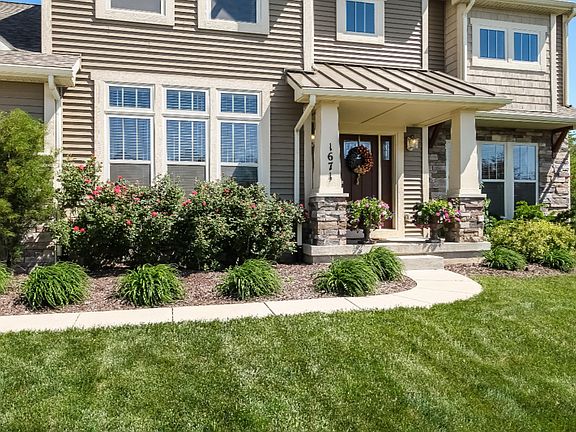 Custom Parade of Homes! Spacious open floor plan with many added upgrades such as, custom trim and molding, decorative beams, custom built ins. Oversized great room with extra high ceiling and large windows with beautiful view of tree lined backyard. Gourmet kitchen with large island, quartz and granite counter tops, window pane cupboards with lighting, perfect for entertaining next to great room. Four bedrooms and three full bathrooms all upstairs. Spacious master suite has extra high ceilings with custom built in storage. Energy star constructed. Two additional finished rooms in basement and custom wood blinds throughout. Large brick paver patio with beautiful landscaping and custom retractable awning for a beautiful backyard oasis. Underground sprinkler & alarm systems. Welcome home.