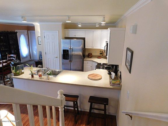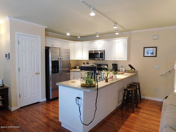Delightful home with peace and serenity that backs Chugach State Park, W/lots of trails to explore! Pristine is the best way to describe this town home! Up-dates are, newer SS appliances, carpet, laminate flooring, lighting & painting. Kitchen, dining, living room, laundry, half bth,master bedroom W/ private bth & walk-in closet are on main level. Upstairs loft, bedroom W/walk-in closet & full bth