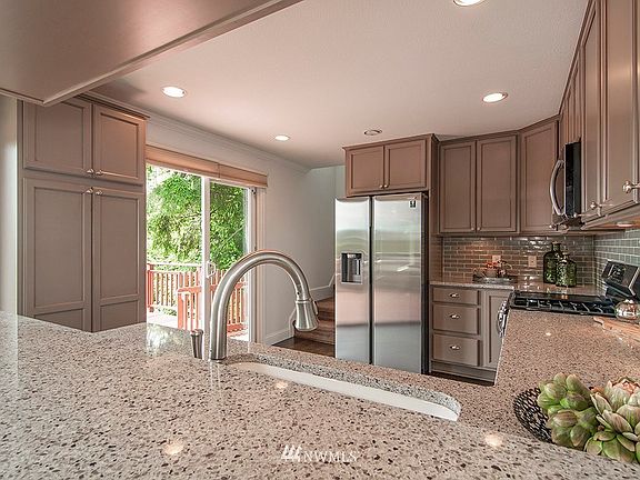 Beautiful Gregory Heights home perched high on the hill with very pleasant southerly views of the Puget Sound, Mt Rainier and Normandy Park. Tons of windows, sunlight and warm accents. Rich dark hardwood flrs on main level. Updated kitchen w brand new stainless applnc's including gas range. Best views are from the top flr en-suite including a very tastefully renovated 5 piece bath & private deck. Entertainment size deck is the perfect place to soak in the views and enjoy an evening libation. Huge, flat, fenced & private backyard. Abundant upgrades including AC & dimming lights throughout. Newer 30 yr roof, H2O & furnace. Copper lines including main supply line. A wonderful combination of privacy & comfort. This has something for everyone!